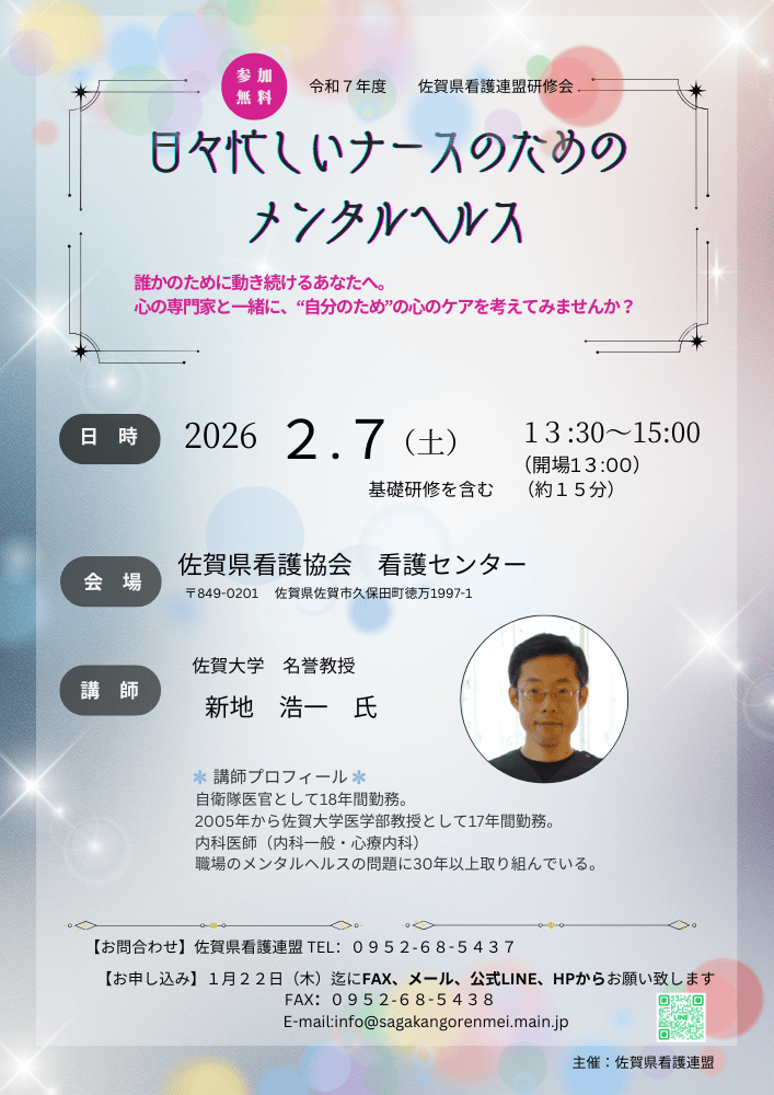 佐賀県看護連盟では、「日々忙しいナースのためのメンタルヘルス」の研修を佐賀大学名誉教授 新地 浩一 氏をお招きし開催いたします。みなさまのご参加をお待ちしております。